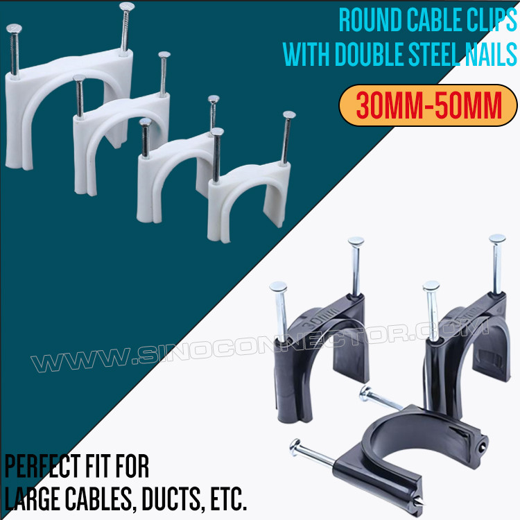 Tek çimento çivili veya çift çimento çivili yuvarlak kablo kroşeleri, uzun telleri, kabloları veya boruları bir yüzeye sabitlemek ve düzenlemek, bunları düzenli ve organize tutmak, hasardan korumak ve takılma tehlikelerini önlemek için kullanılır. Normalde PE (Polietilen) malzeme, farklı renkler ve farklı tip ve miktarlarda tel, kablo veya boruya uyum sağlayacak çeşitli boyutlarda mevcuttur. Kablo klipsleri genellikle duvar, masa veya diğer yapılar gibi bir yüzeye takılabilen küçük, sağlam cihazlar olarak tasarlanmıştır. Kablonun yerleştirilebileceği merkezi bir kanala veya açıklığa sahiptirler.