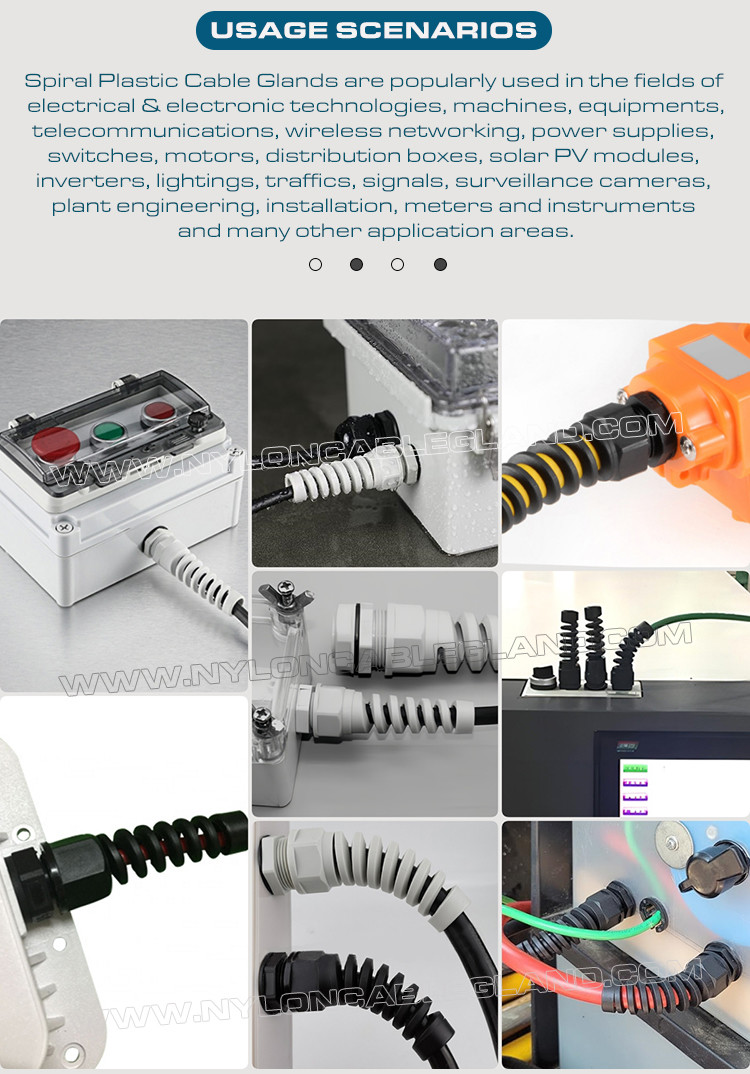 【Yaygın Uygulama】 Spiral gerilim azaltıcı kablo rakorları, kablo sabitleme, bağlantı kutusu bağlantıları, dağıtım panelleri, elektrik dolapları ve diğer elektrikli cihazlarda yaygın olarak kullanılmaktadır. Kablo rakorunun sökülmeden takılması kolaydır.