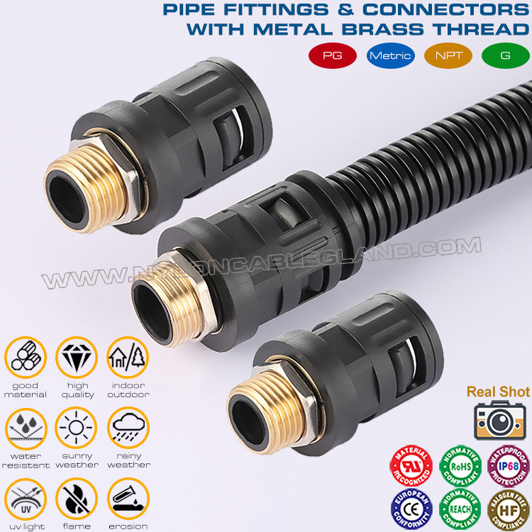 Naylon 6 düz konnektörler (boru bağlantıları) siyah RAL9005 c/w Metal Erkek Dişli PG7~PG48 Oluklu Borular için AD7~AD108 elektrik, sıvı ve gaz dağıtım sistemlerinde yaygın olarak kullanılan bir tür bağlantı cihazıdır. Yüksek sızdırmazlık performansına sahiptir ve özellikle oluklu boruları bağlamak için kullanılır. Yüksek sıcaklık, yüksek basınç ve aşındırıcı sıvıların veya gazların taşınması sırasında güvenli ve güvenilir bağlantılar sağlayabilir.